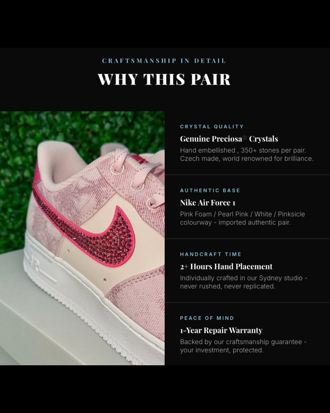 Send us your sneakers, heels, handbag, phone cover - almost anything - and our Australian artisan will hand embellish them with genuine Preciosa® crystals to your exact specifications. Choose your crystal colours, your coverage, your vision.