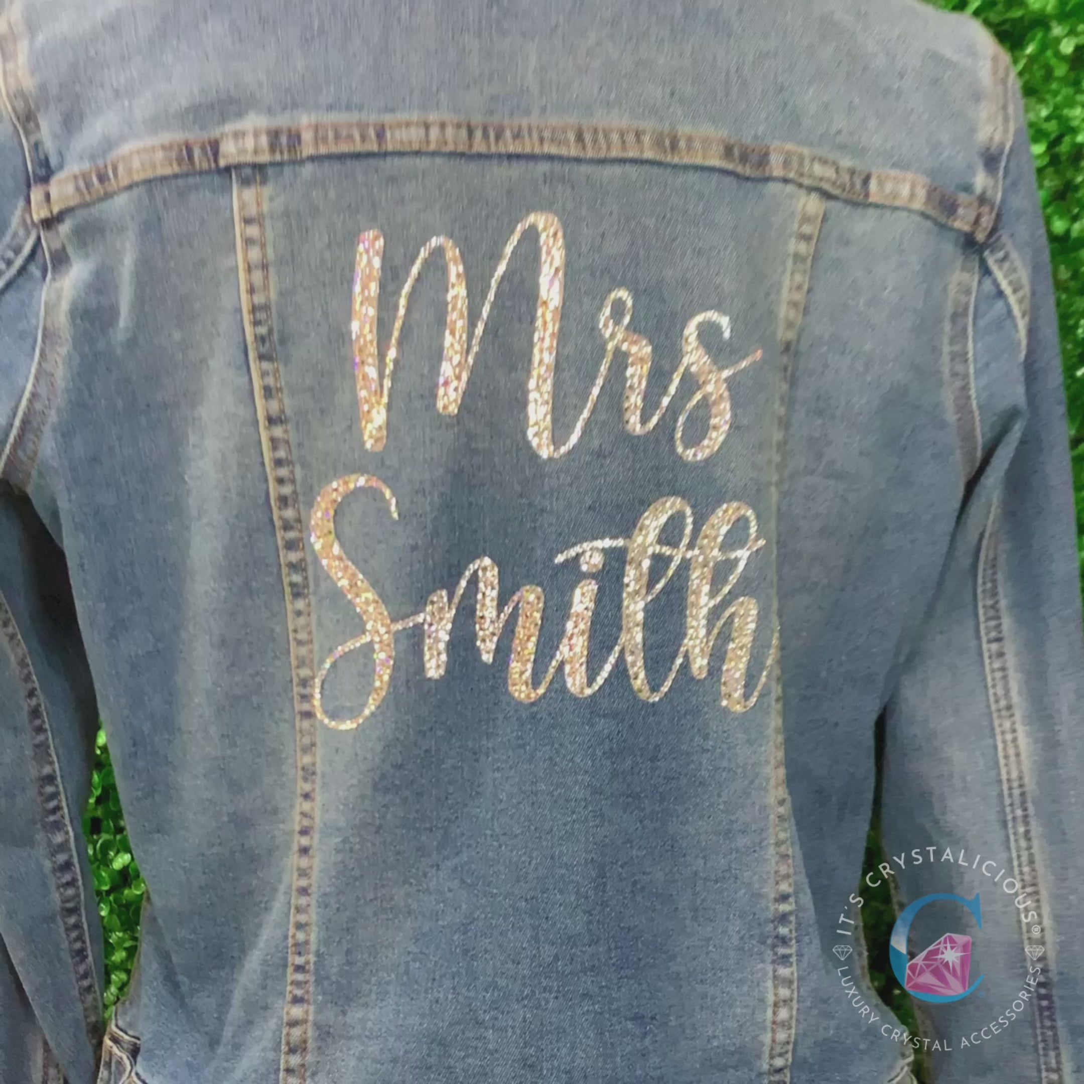 Personalised denim jacket for brides hand embellished with Preciosa® crystals featuring 'Mrs' for a stylish, elegant finish. A statement piece perfect for your special day and beyond with premium craftsmanship.