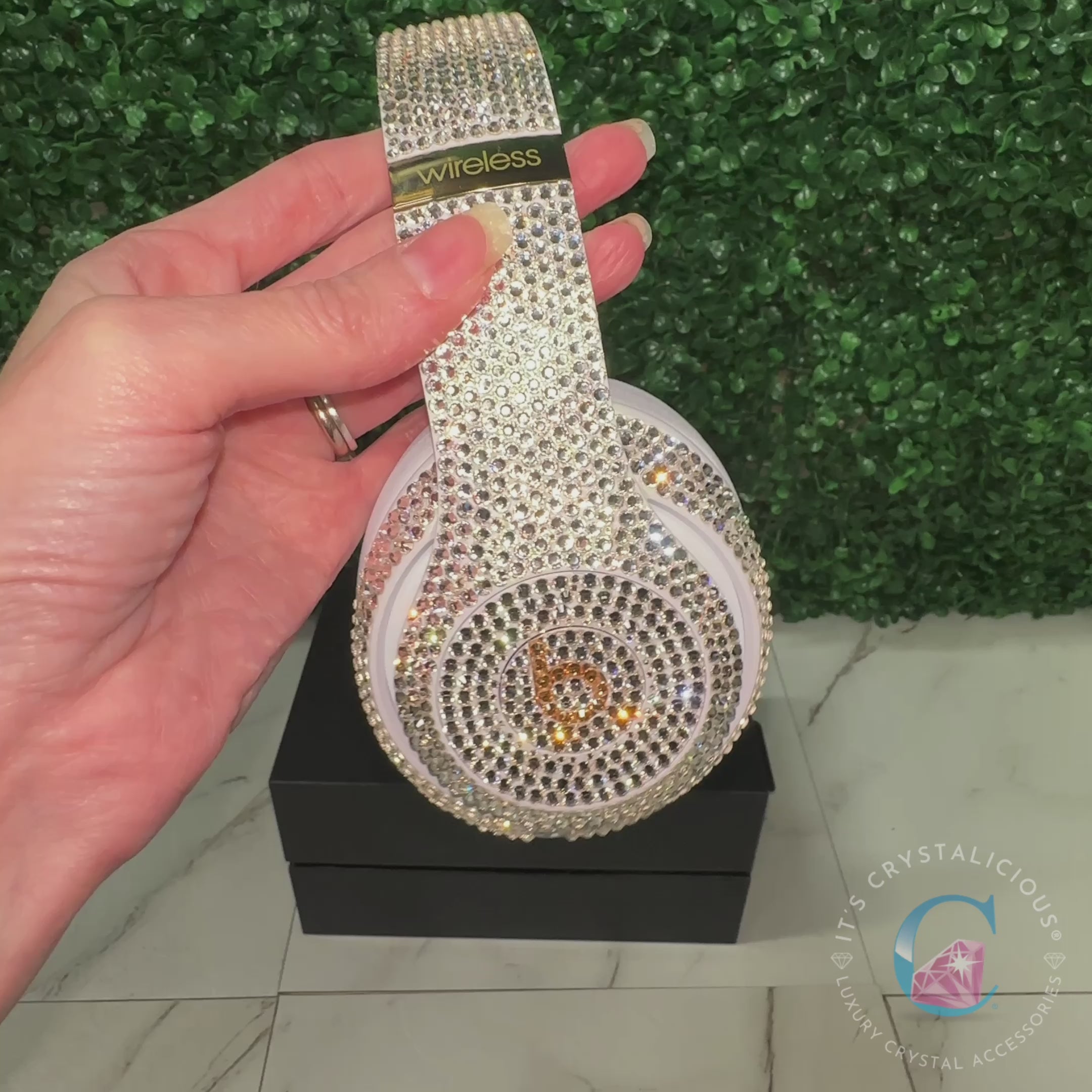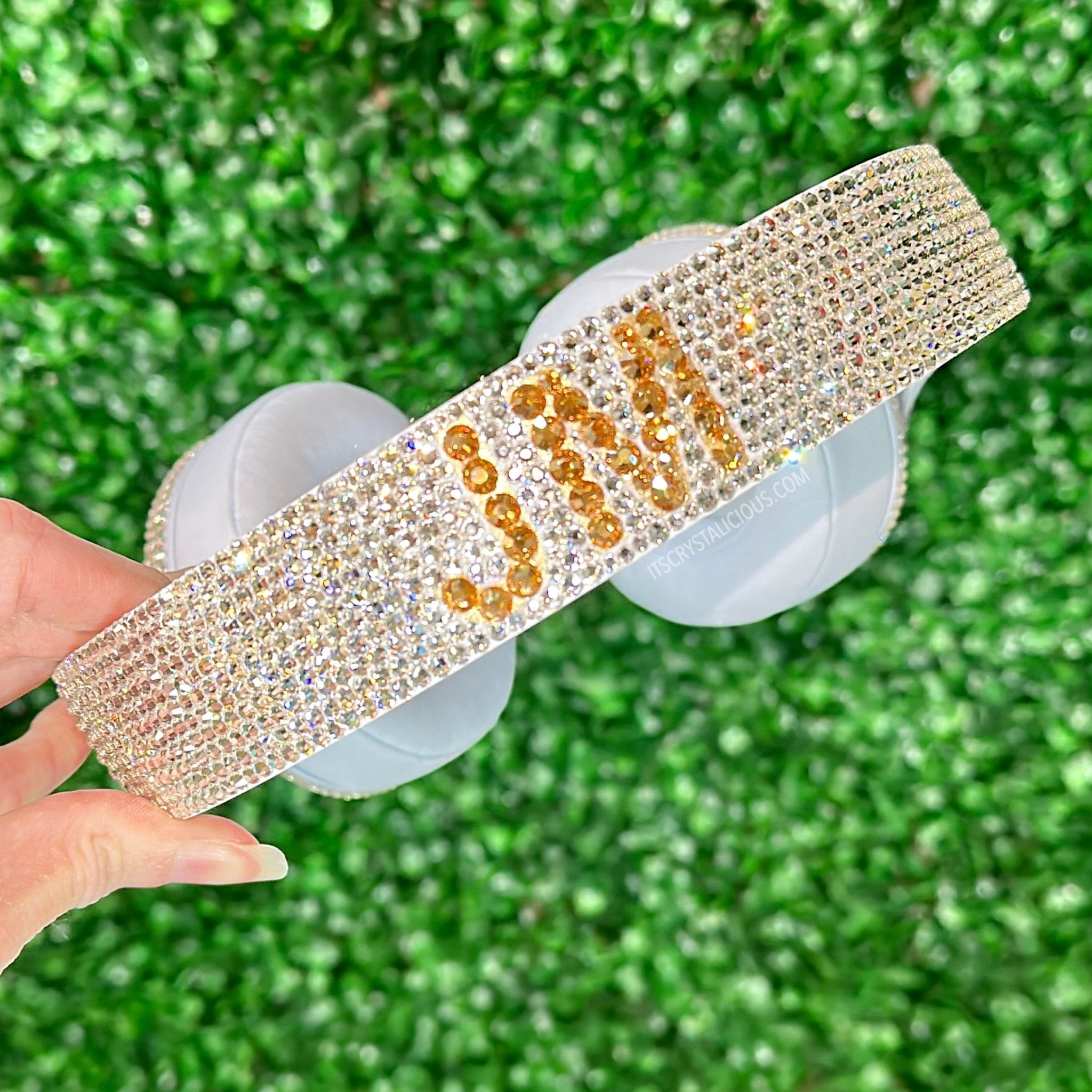 Customised with your initials or name on these Beats by Dre Studio Pro headphones in sandstone, hand embellished with Preciosa® crystal and golden honey stones for a warm, luxurious finish. A statement piece that combines premium sound with premium craftsmanship.