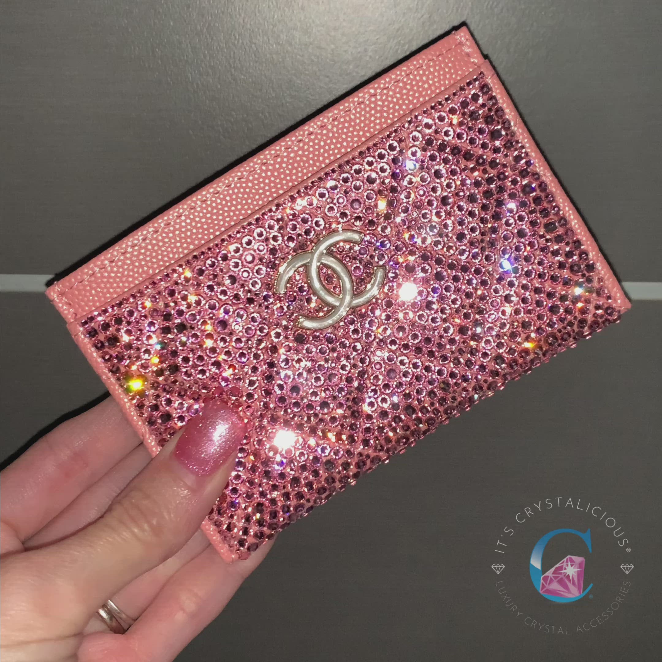 Authentic Chanel card holder in iridescent pink, hand embellished with Preciosa® crystals for a luxurious, elegant finish. A statement piece that adds premium style to your everyday essentials.