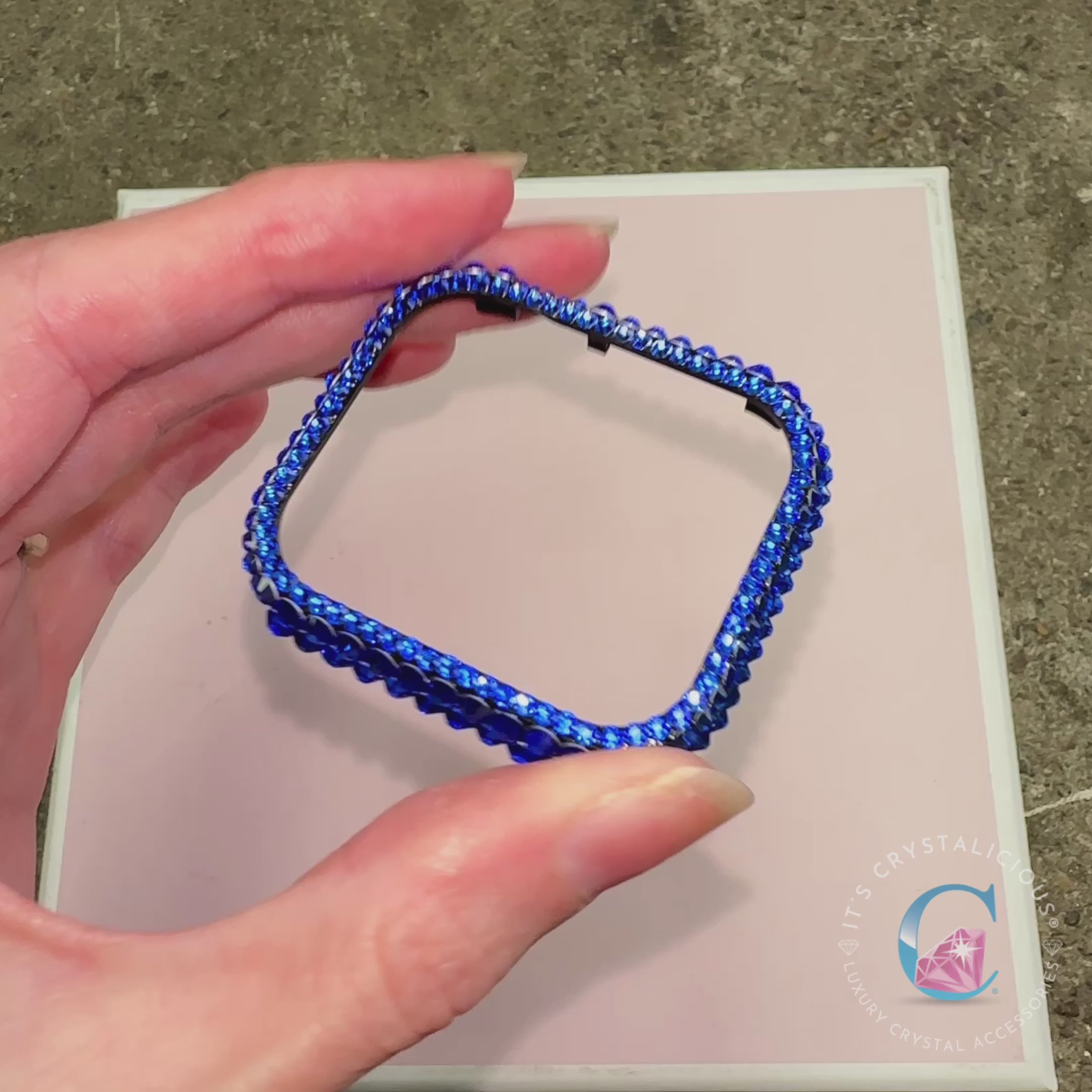 Apple Watch cover with black finish, hand embellished with Preciosa® sapphire crystals for a vibrant, ocean inspired finish. A statement piece that protects your Apple Watch with premium craftsmanship.