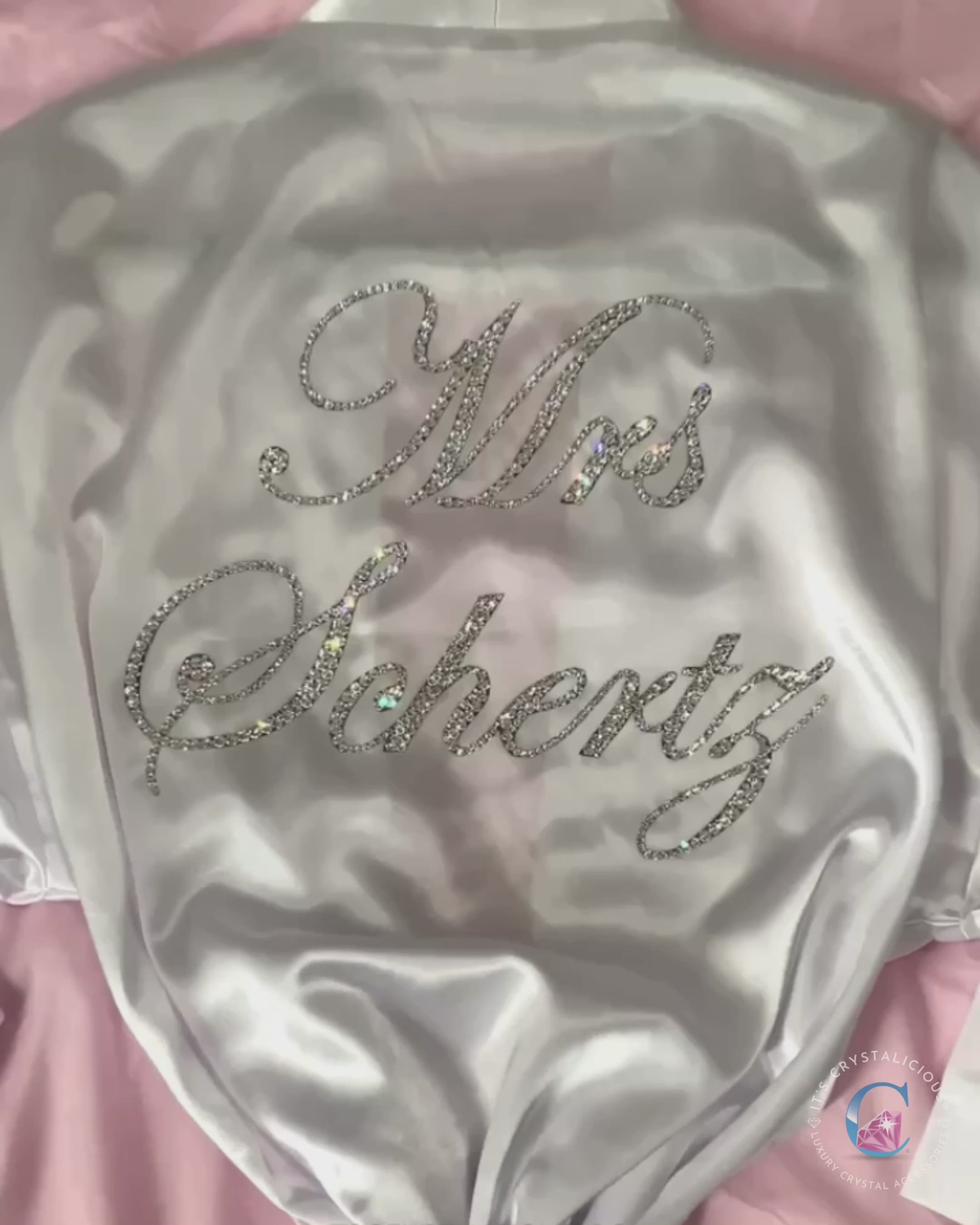 White personalised satin robe hand embellished with Preciosa® crystals featuring 'Mrs' for a luxurious, elegant finish. A statement piece perfect for your special day with premium craftsmanship.