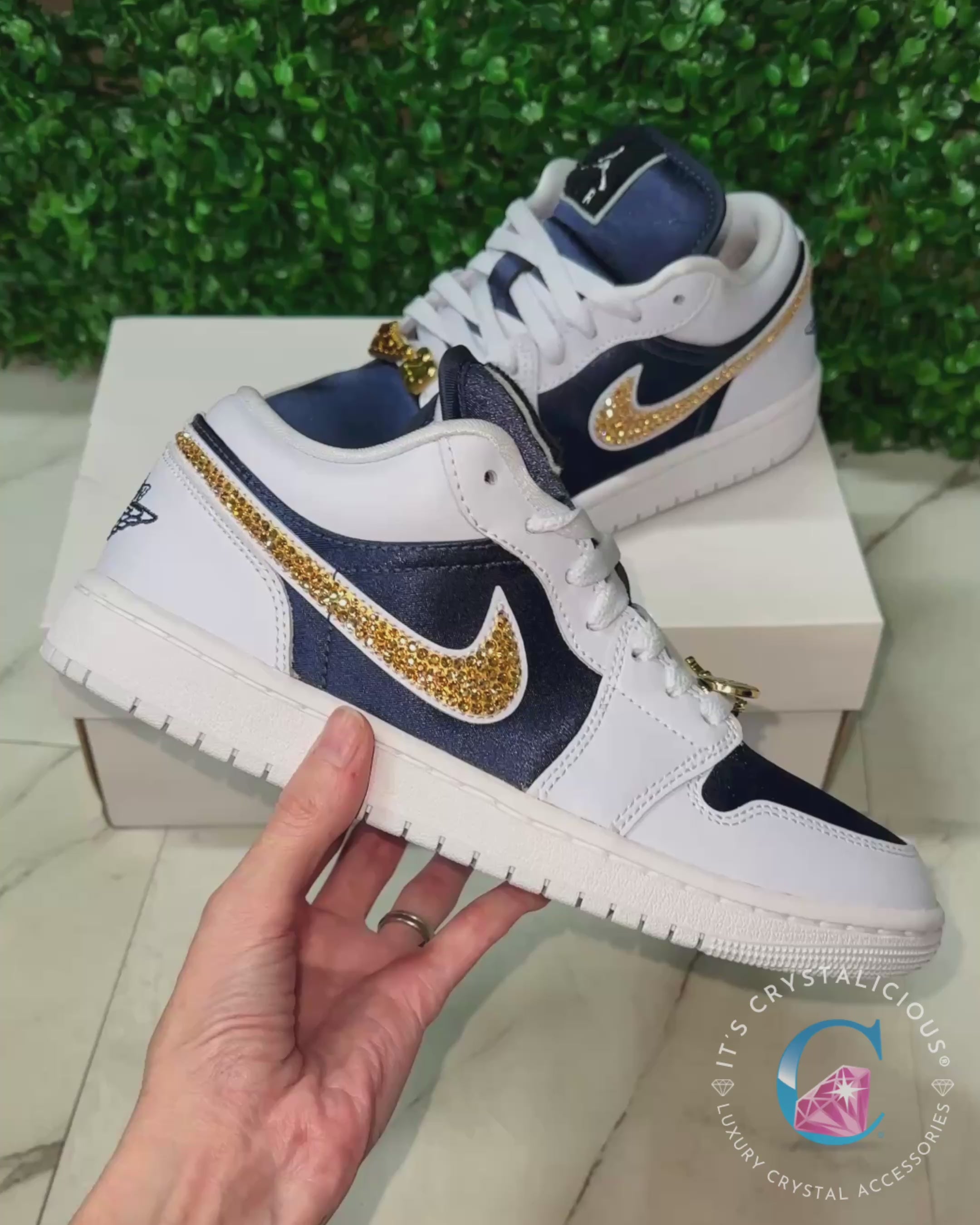 The Jordan 1 in Football Grey/Midnight Navy, hand embellished with Preciosa® golden honey crystals for a warm, luxurious finish. A statement piece that elevates any casual look with premium craftsmanship.