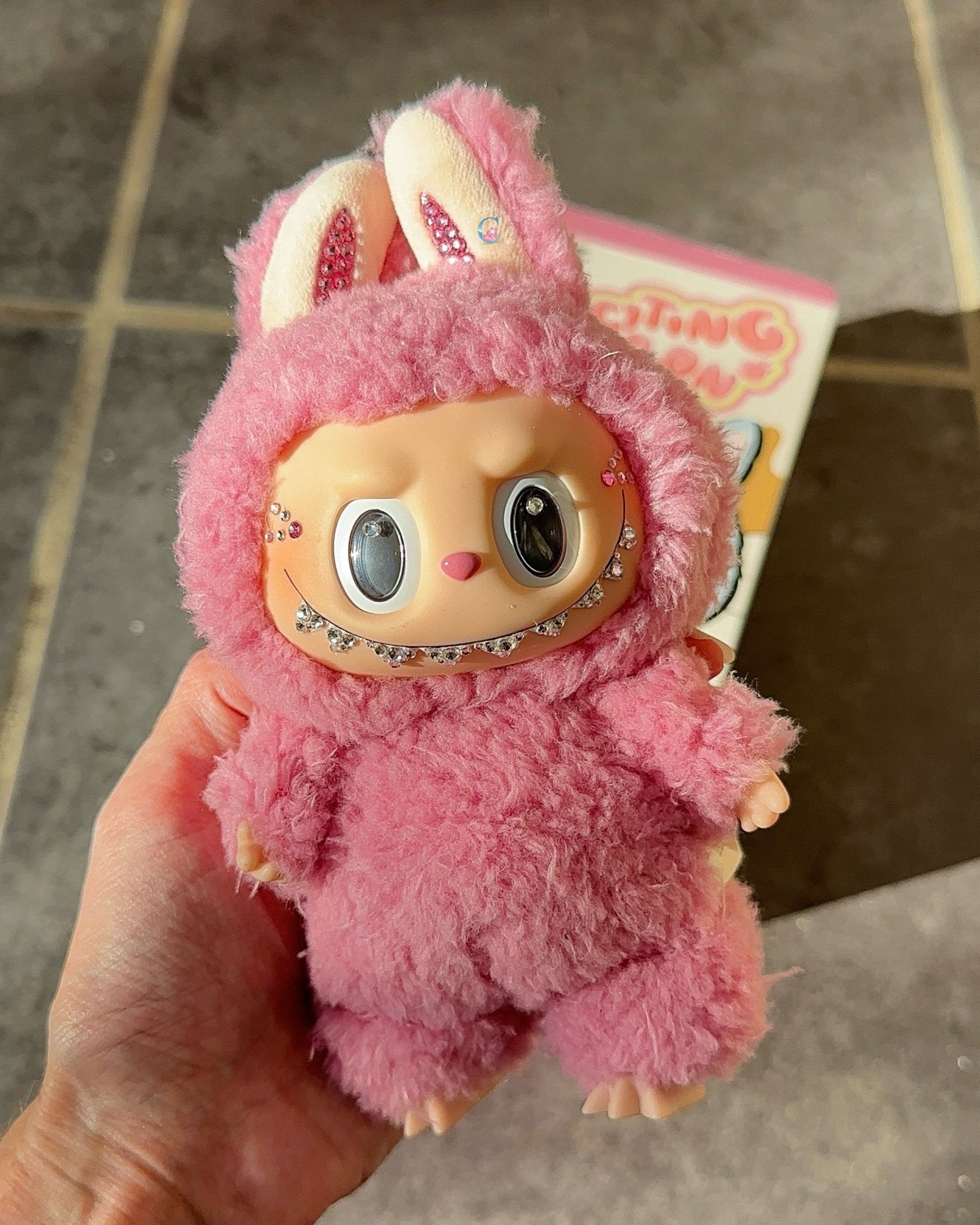 LABUBU THE MONSTERS 'Exciting Macaron' vinyl figure in Lychee Berry, hand embellished with Preciosa® crystals for a luxurious, collectible finish. A statement piece that adds premium style to your collection or bag.