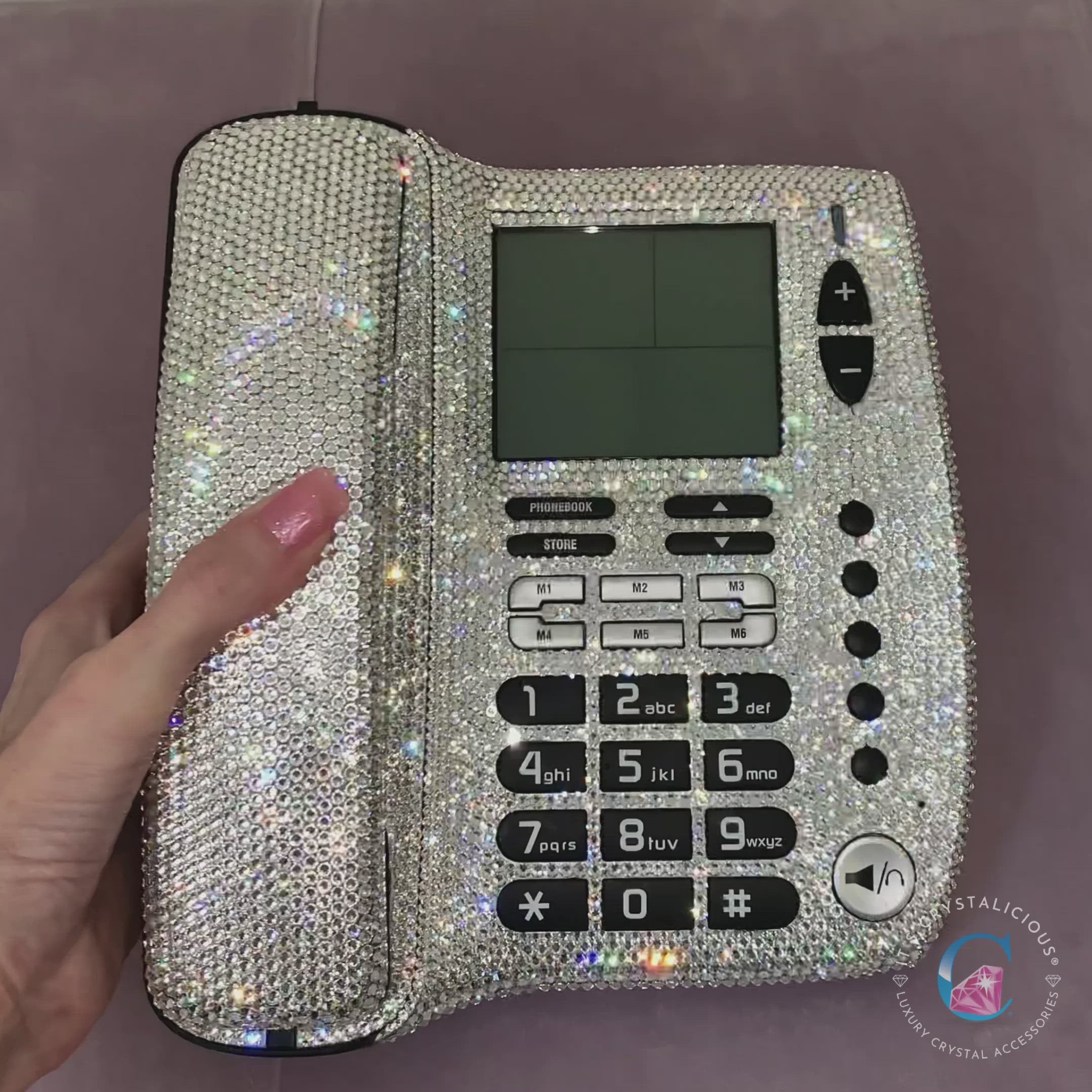 Desk phone hand embellished with Preciosa® crystal clear stones for a sleek, luxurious finish. A statement piece that adds premium style to your workspace with full functionality.