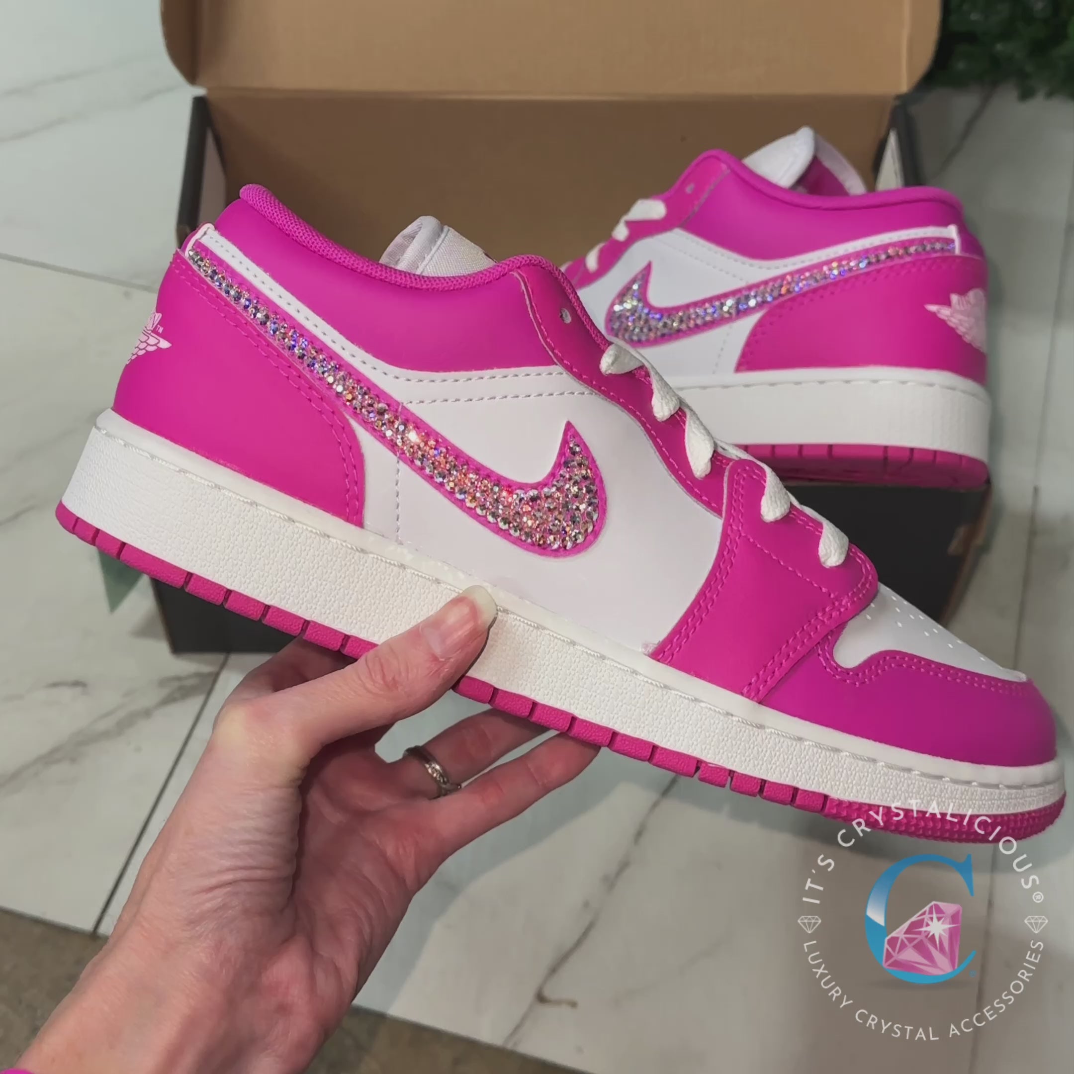 The Jordan 1 Low in White/Fire Pink, hand embellished with Preciosa® crystal AB stones for a vibrant, multi dimensional finish. A statement piece that elevates any casual look with premium craftsmanship.