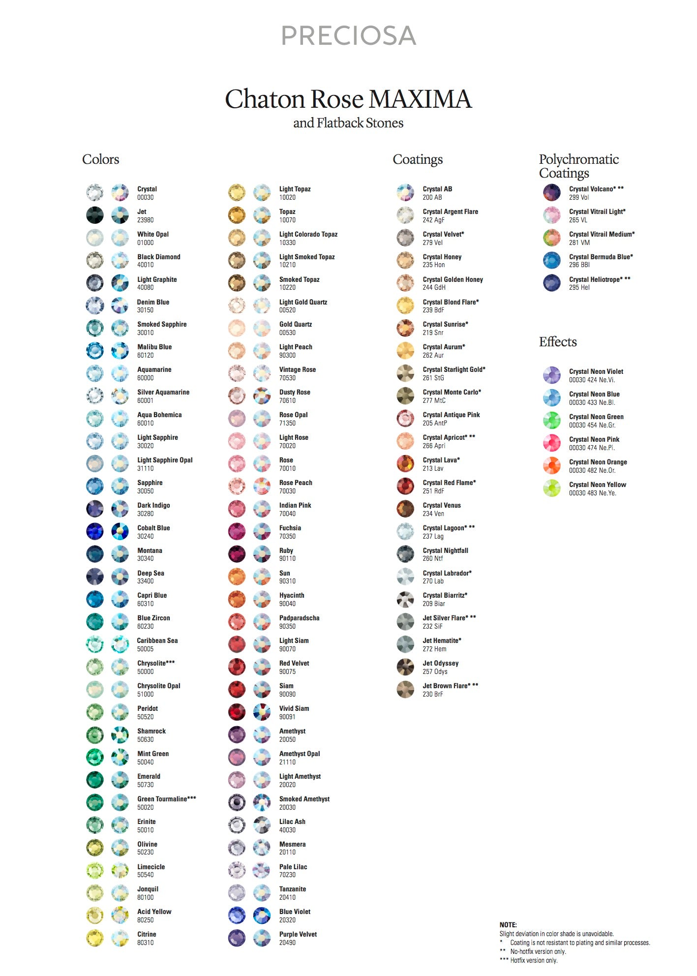 Preciosa® crystals are available in an extensive range of colours and finishes. The colour chart below shows our current range. Key finishes include: